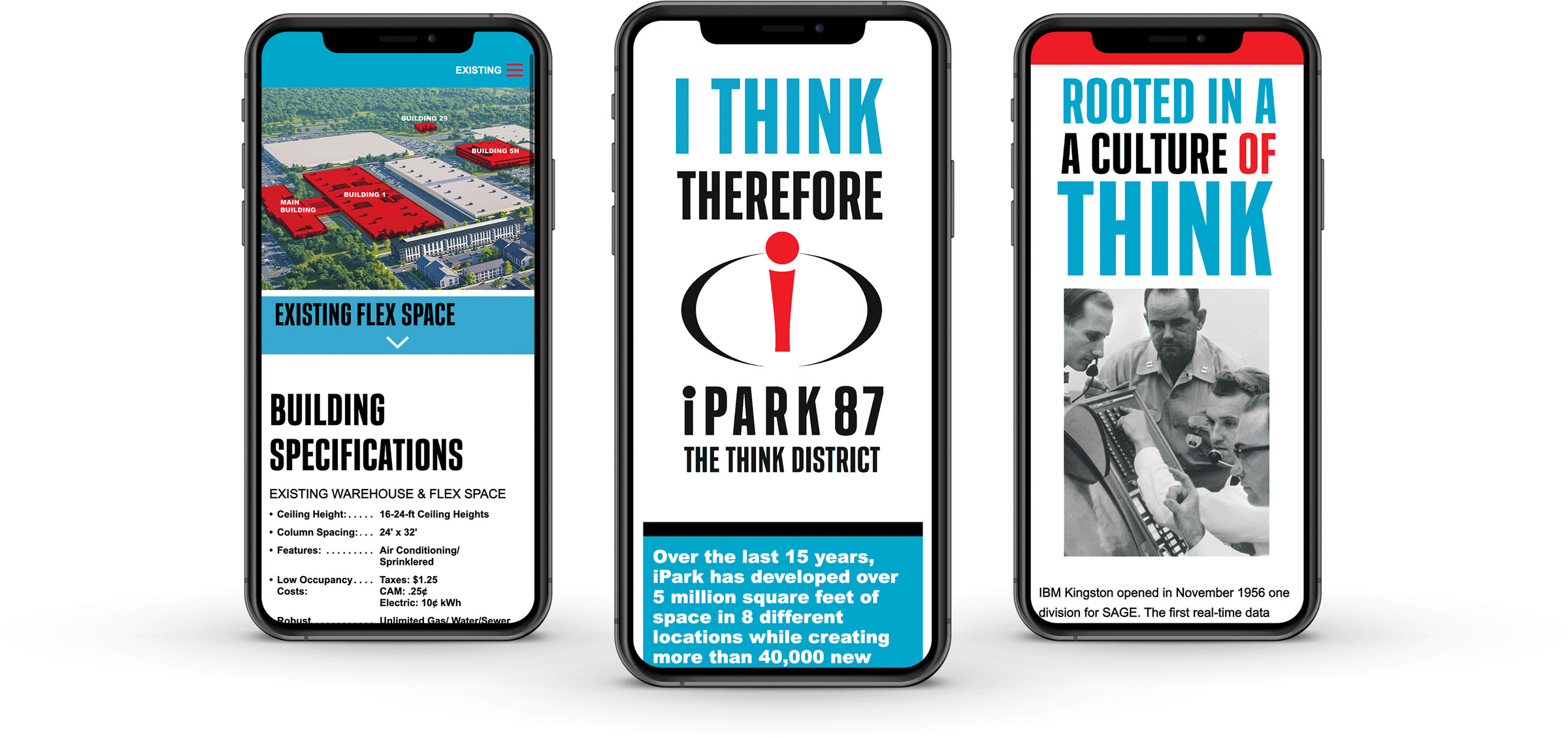 Located at the historic IBM Kingston site, iPark 87 merges office space with rich tech legacy. National Resources engaged us to create a unique brand and website showcasing the innovation and vibrancy of the tech, media, and content sectors it seeks to attract.