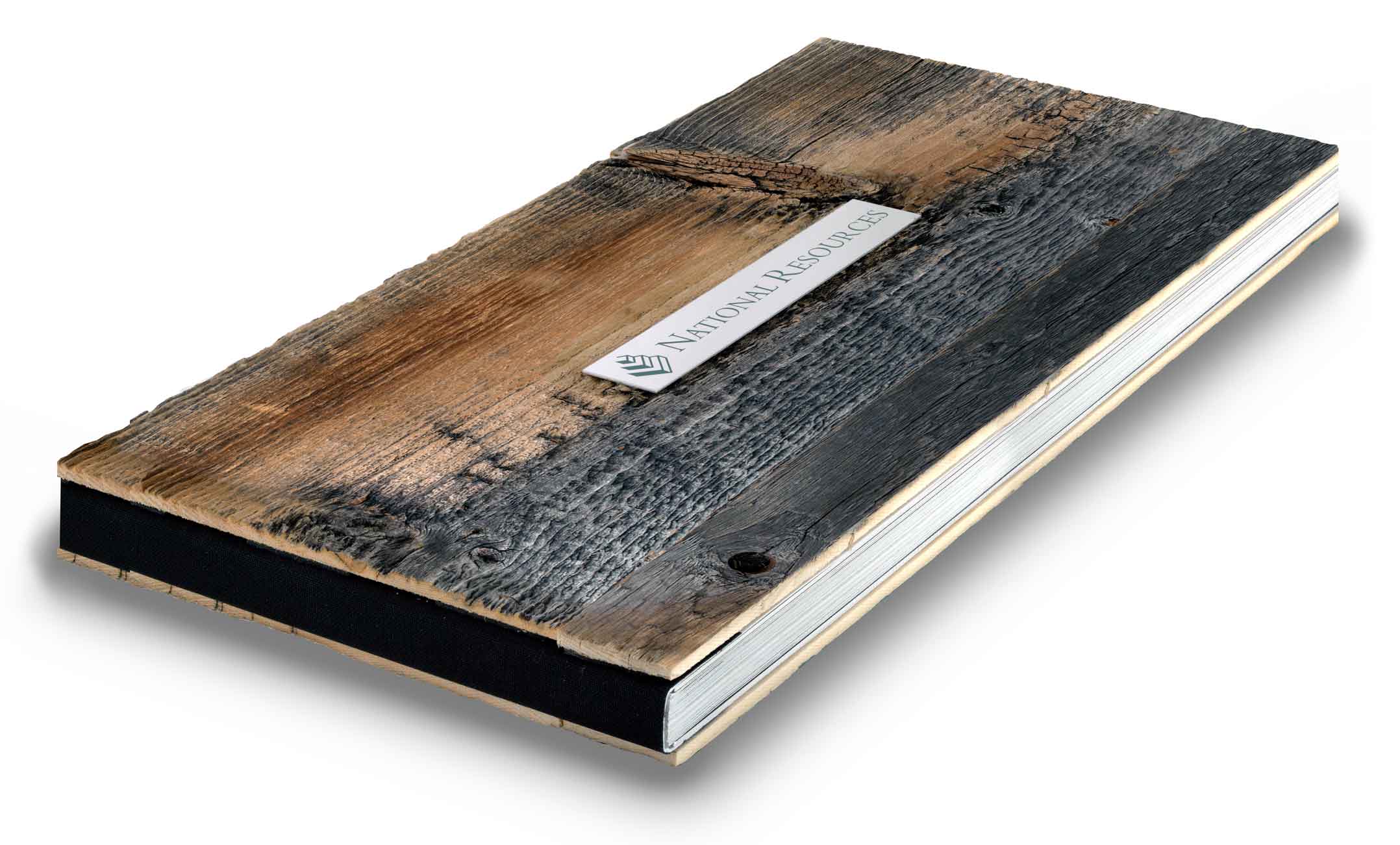 The outside front & back covers are made of recycled wood which is mounted on the brushed alumimum inside front & back covers. The recycled wood gives each cover a unique look. There are 4-color photos printed on the the brushed aluminum inside covers. The 76 text pages are perfect bound with the covers.