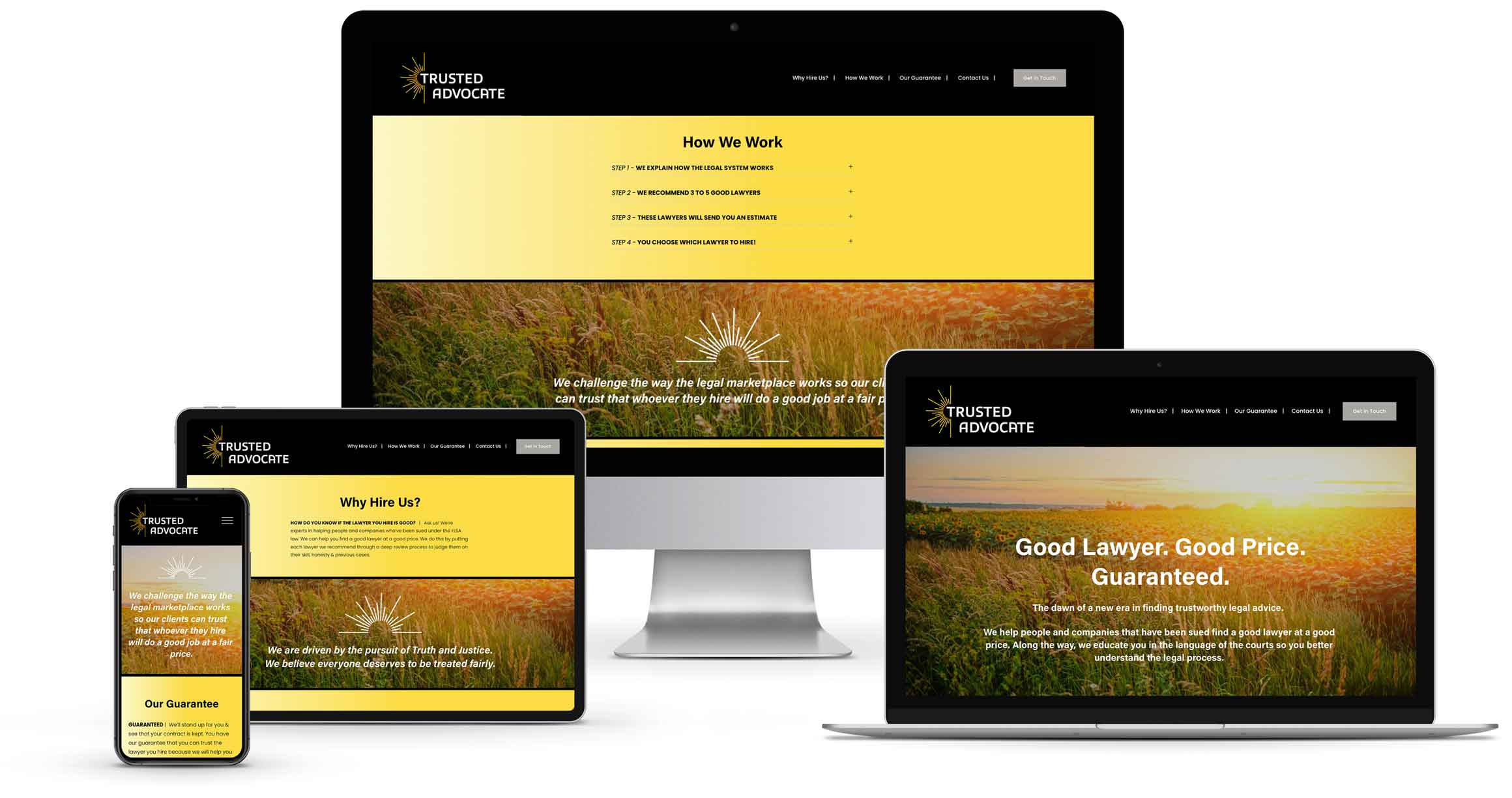 In the website design, we meticulously combined the client's core beliefs with concrete operational details. This synergy between evocative imagery and factual clarity aims to provide reassurance and build trust with potential clients. It's a representation of Trusted Advocate's commitment to offering a transparent, reliable pathway in the often-complex legal landscape.